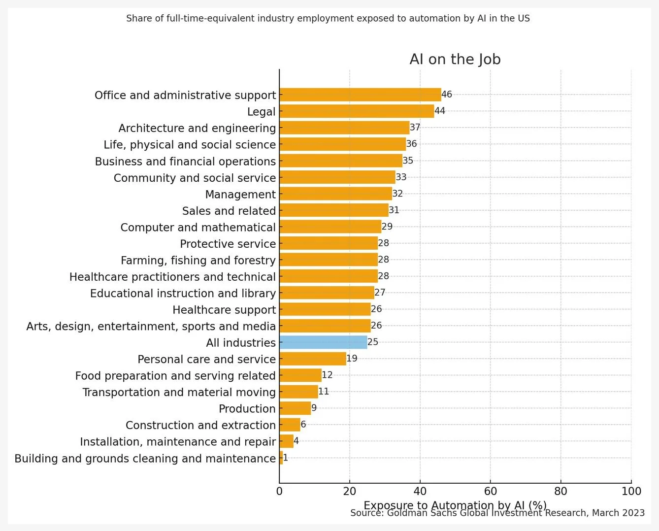Podľa Goldman Sachs môže byť jedna štvrtina súčasných pracovných miest v Spojených štátoch v rôznych odvetviach automatizovaná pomocou umelej inteligencie. Analýza sa zaoberala 900 povolaniami v 22 odvetviach od práva cez zdravotníctvo až po predaj.